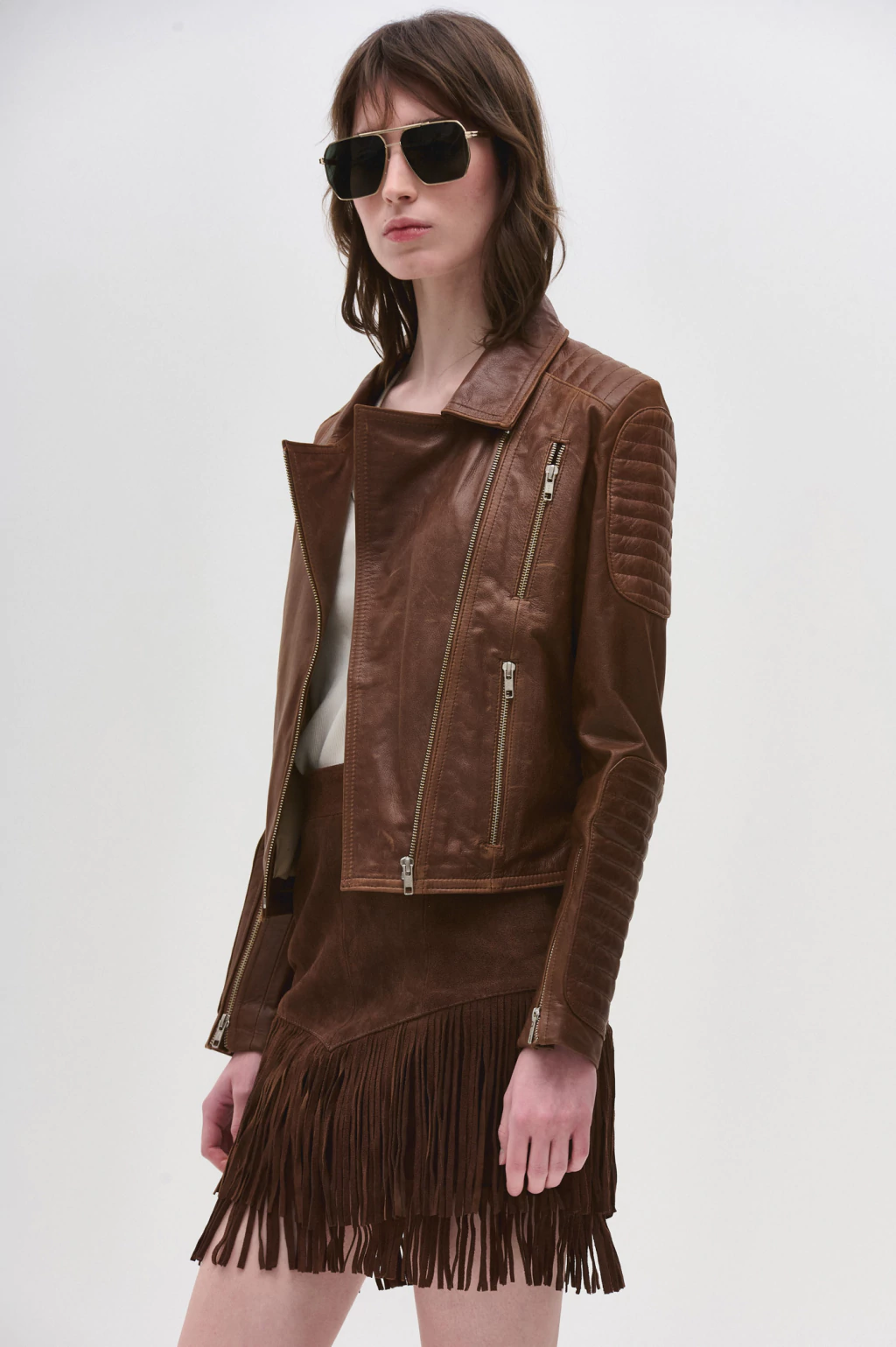 Campera Violeta, confeccionada en cuero 100% de oveja de alta calidad. Su diseño entallado y calce justo se adapta perfectamente a tu figura, brindando un look sofisticado.