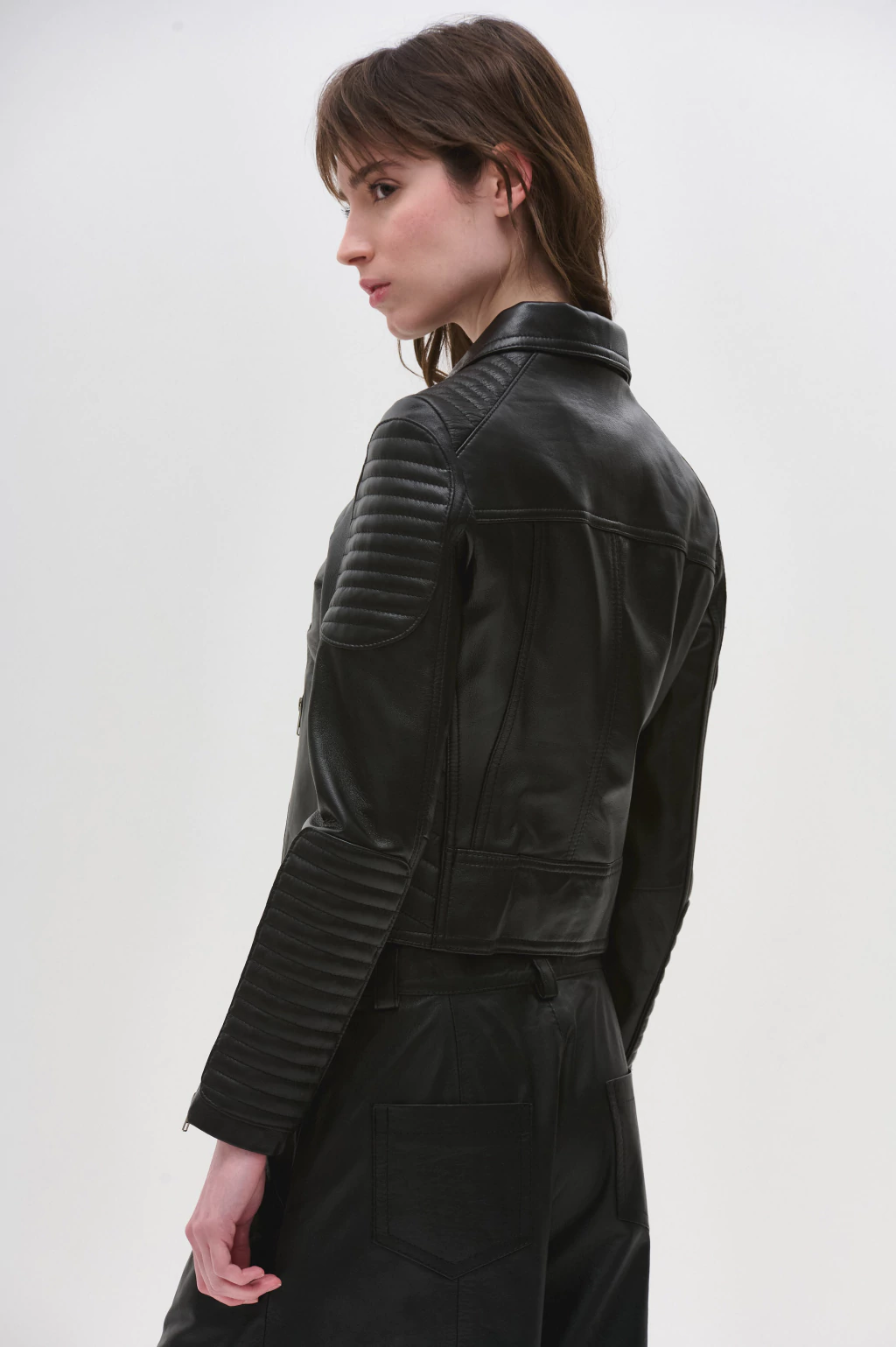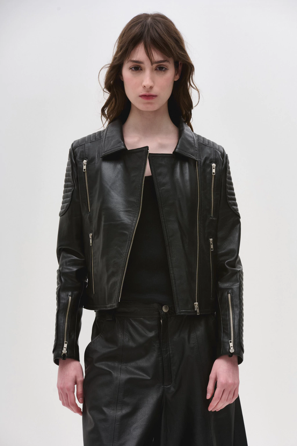 Campera Violeta, confeccionada en cuero 100% de oveja de alta calidad. Su diseño entallado y calce justo se adapta perfectamente a tu figura, brindando un look sofisticado.