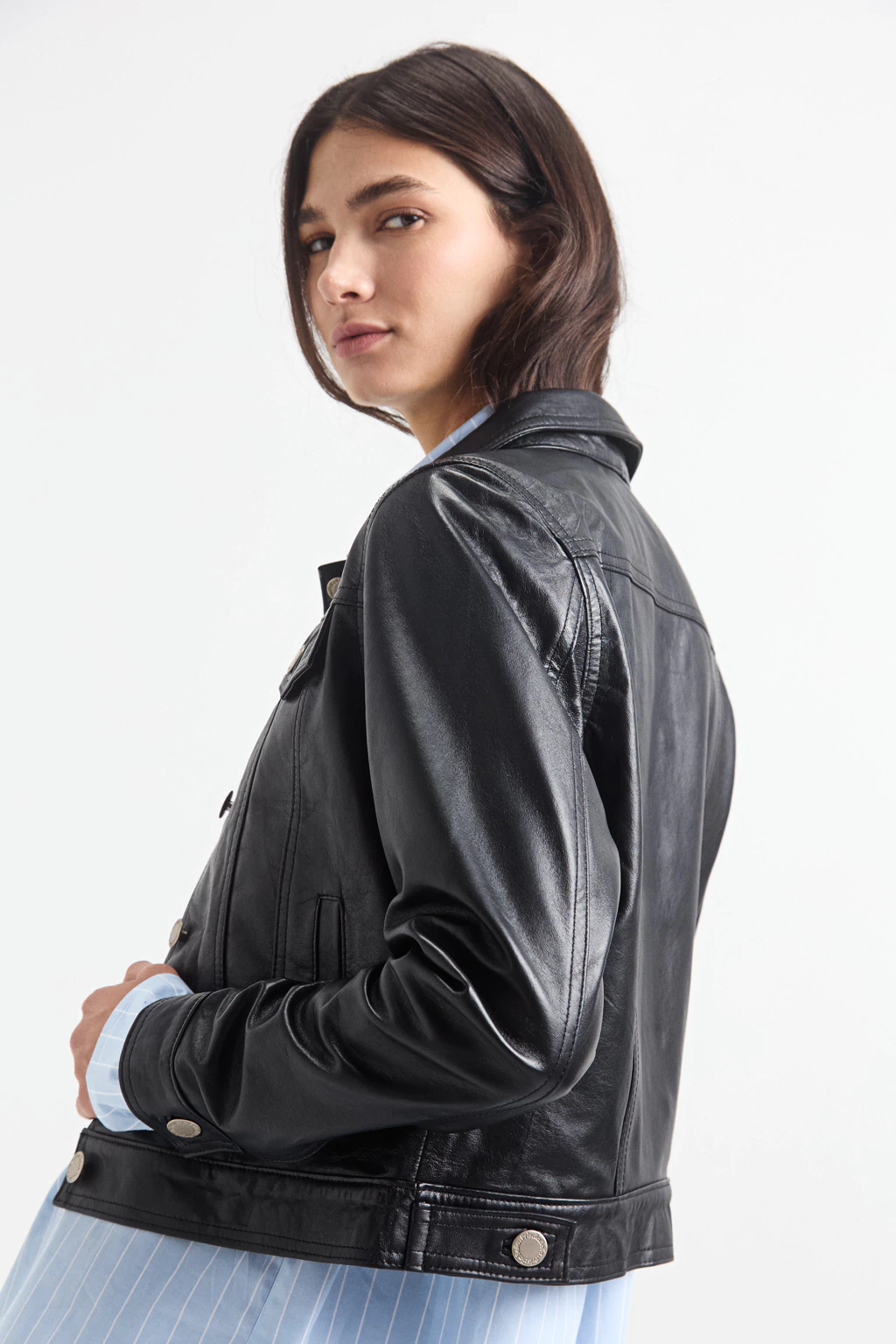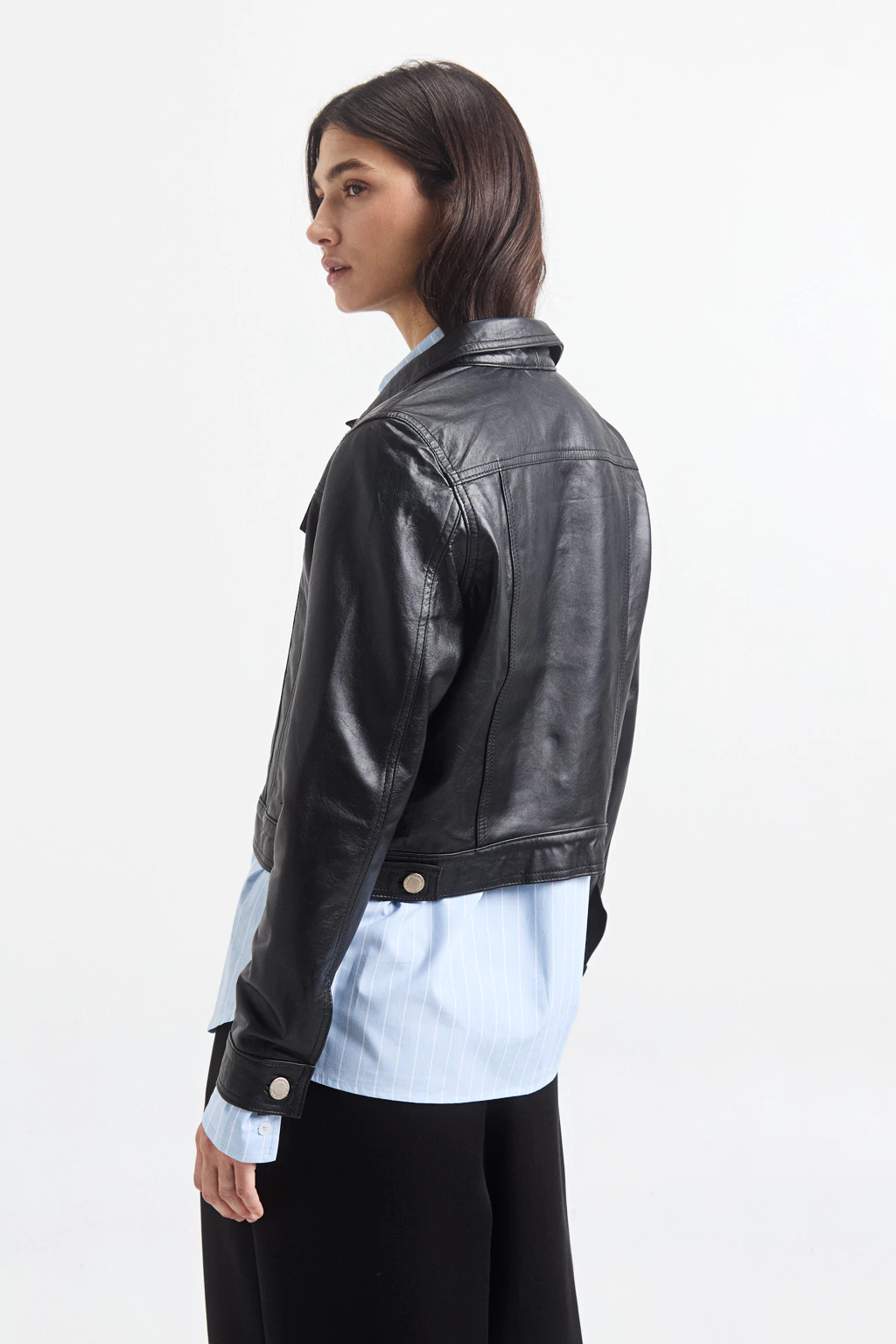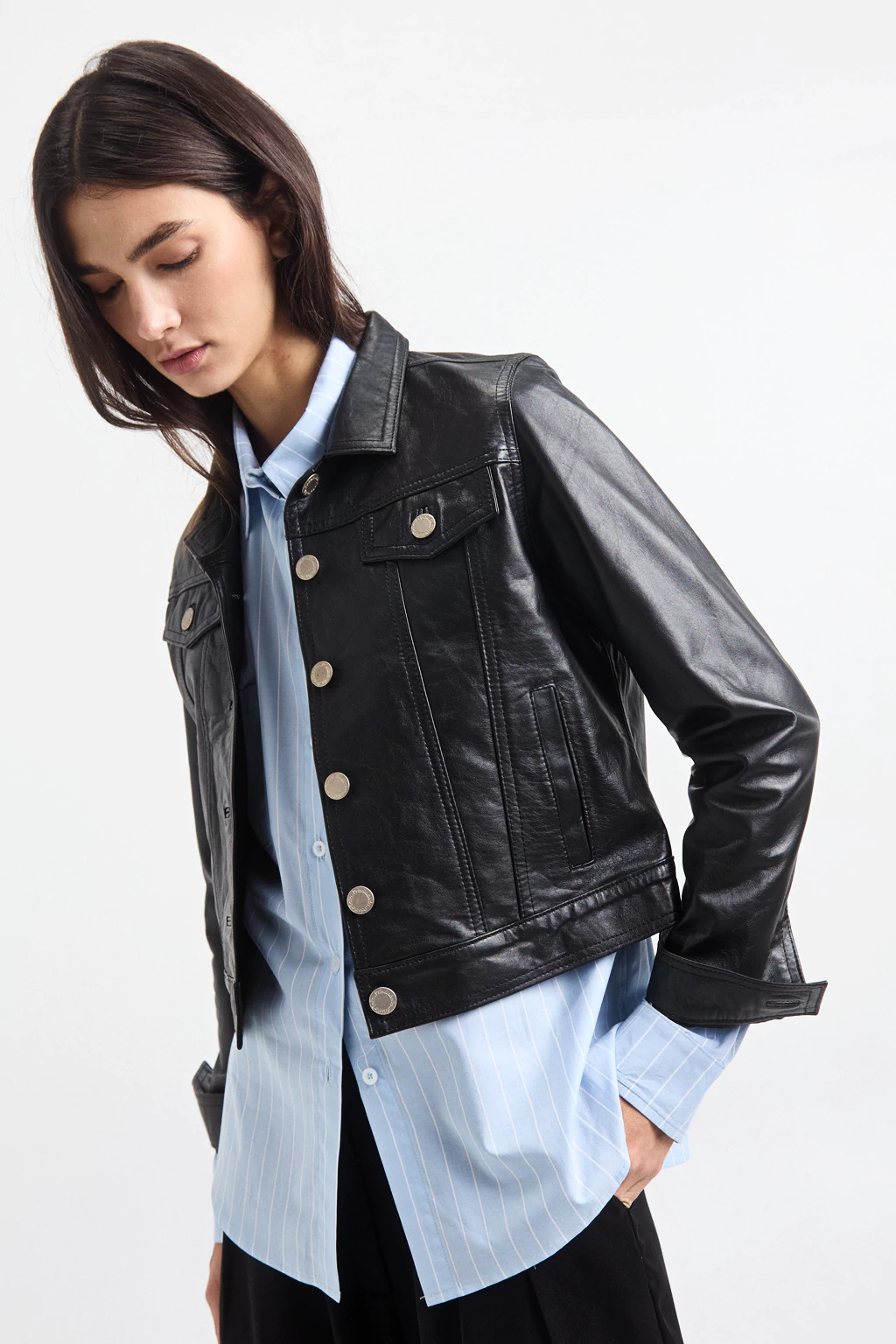 Descubre la sofisticación de la Campera de cuero 100% de oveja, diseñada con un elegante corte de campera de jean. Su calce justo resalta la figura, mientras que el cierre con botón jeanero añade un toque clásico.
