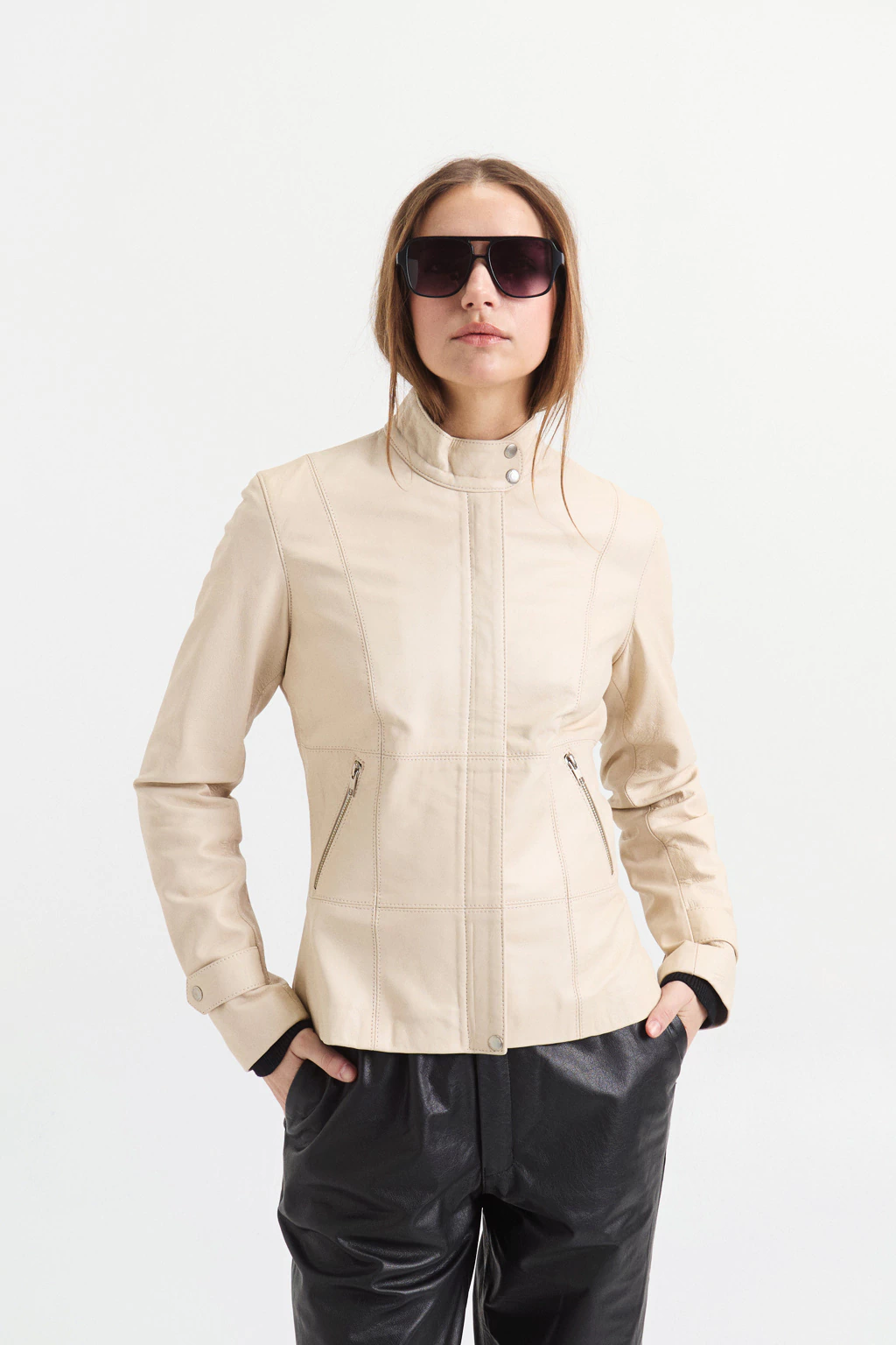 Descubre la Campera Breena, una pieza única elaborada en cuero de oveja de alta calidad. Su corte clásico y entallado resalta la figura, mientras que el cuello mao aporta un toque moderno.